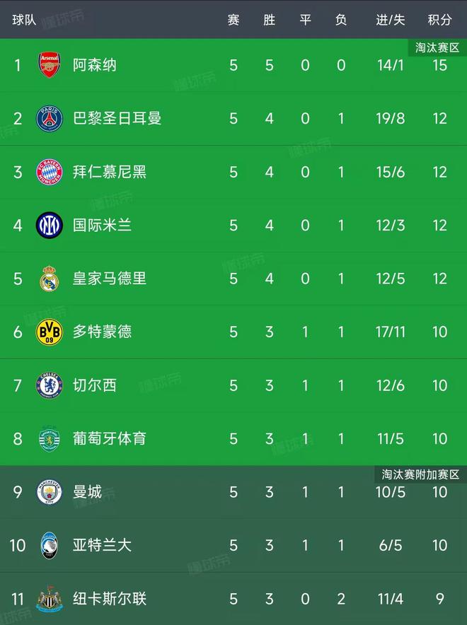 北京时间11月27日凌晨,欧冠第五轮剩余9场比赛结束。本轮所有比赛均已结束。一起来看看最新的排名变化吧!阿森纳是上届欧冠资格赛中唯一一支保持不败战绩的球队。本赛季他们将在主场与拜仁的激烈交锋。上半场第22分钟,枪手采用角球战术,廷布尔头球打破僵局。第33分钟,拜仁防守区内长传击中格纳布里。后者助攻卡尔扳平比分。这是枪手今年欧冠联赛中首次丢球。下半场,枪手利用拜仁的失误,在马杜凯和马蒂内利的努力下,在第70分钟和第77分钟连进两球结束了比赛。枪手队五场比赛全部获胜,积15分,稳居榜首。拜耳n队遭遇首败,目前与巴黎、国米、皇马并列第三。已经取得五连胜的枪手队本赛季在主场迎战英超球队托特纳姆热刺队,卫冕冠军巴黎队。上半场第35分钟,利萨里松头球首开纪录。第45分钟,维西尼亚开出角球战术后抽射破门,巴黎扳平比分。下半场,两队都达到了进球的高潮。穆阿尼刚刚进球,维西尼哈梅开二度,再次扳平比分。随后路易斯和威廉帕乔连续梅开二度扩大比分。穆阿尼扳回一球,罗梅罗手球破门,维西尼亚完成点球帽子戏法,5-3结束比赛。最后一分钟,卢卡斯·埃尔南德斯因肘部犯规被红牌罚下。姆巴佩的第四个进球拉开了皇马首回合对阵奥林匹亚科斯队的进球大战。皇马依靠维尼修斯的两次助攻和姆巴佩的四粒进球,4-3险胜,积3分结束各条战线连胜,积12分暂居欧冠第五位。西甲另一支球队马德里竞技主场2-1击败国际米兰,送给国际米兰首场失利。马德里竞技第9分钟断球,发起快速反击,阿尔瓦雷斯首开纪录。下半场第54分钟,泽林斯基推射扳平比分。马德里竞技队在最后时刻开出角球,希门尼斯头球破门致胜。利物浦连续两场击败马德里竞技,取得第三场胜利,积9分暂时排名第12位。利物浦不仅在英超遭遇阻碍,在欧冠赛场也遭遇惨败。本赛季他们主场1-4不敌埃因霍温,积9分暂时排名第13位。第6分钟,范戴克双手破门,佩里西c 点球得分,索博斯莱的下一脚射门将红军追平。红军在下半场崩溃,连续丢了三个球,其中蒂尔和戴利什的进球(两球)。其他战绩:帕福斯 2-2 摩纳哥、葡萄牙体育 3-0 布鲁日、法兰克福 0-3 亚特兰大。