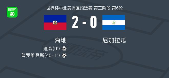 海地和尼加拉瓜在2026年世界杯中北美洲及加勒比地区预选赛第三轮比赛中相遇。比赛初期,卡西米尔精准助攻,迪森冷静射门取得领先。上半场补时阶段,阿卡斯进攻得手,让普罗维登斯再次获得获胜机会。此后,两队均未能扳平比分。最终,海地2-0击败尼加拉瓜,获得世界杯参赛资格。海地国家队自1974年首次参加世界杯以来,时隔52年再次重返世界杯舞台。他们在一场重要比赛的第9分钟攻入首球。迪森利用个人能力拿分。海地1-0尼加拉瓜。第45分钟和第1分钟,普罗维登斯头球再次获胜,海地2-0领先。第9分钟,两队球员上场。比赛要开始了。第9分钟,迪森发挥个人技术优势破门。海地1-0尼加拉瓜。第23分钟结果,海地队的弧线在禁区内倒塌,但裁判没有理会。第32分钟,海地队皮耶罗因伤被罚下场。内森替补上场。第45分钟和第1分钟,普罗维登斯头球破门,海地2-0领先。第60分钟,班西主罚任意球,皮球击中门将。第66分钟,Xperiense小角度射门,但皮球被门将挡出。球队阵容技术统计
