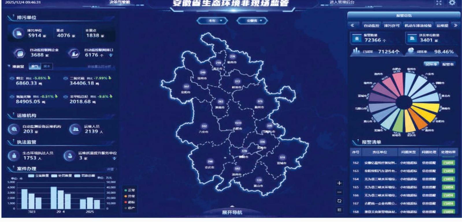 安徽省生态环境非现场监测平台。省执法局执法人员在自动监控站调查取证。芜湖市执法人员正在烟雾采样平台进行检查。责任重于泰山,使命催人奋进。 “十四五”期间,安徽省生态环境厅牢牢把握高质量发展核心任务,强化技术加固,加快构建感知、分析、决策、执行于一体的全链条生态环境智慧执法体系,实施远程监管、移动监管、预警。以防控为特征的“互联网+”监管执法新模式,实现“不扰民”为守法企业提供优厚服务精准监管违法企业“无处不在”,为高标准打好污染防治攻坚战、建设好安徽注入执法时刻。截至2025年11月30日,全省主要污染物排放单位超标自动数据监测天数同比下降66.4%。二氧化硫、颗粒物、氮氧化物排放总量分别下降8.0%、5.0%、化学需氧量、氨氮排放总量分别下降8.4%和0.3%,全省PM_2.5平均浓度为32.2微克/立方米,同比改善2.1%;全省地表水断面水质优良天数比例为84.7%,同比提高2.1个百分点;评价为86.6%,提高了3.6个百分点比目标评估。全省生态环境满意度连续五年超过90%。制定“智慧管理”创新方案并高水平大力推进。安徽省委、省政府高度重视和支持生态环境智能化管理,连续多年将污染源自动监测“三全范围”任务纳入省政府调度范围。今年以来,我省全面实施定期航运,推动场外生态环境治理向纵深、向实化发展。省生态环境厅主要负责同志多次深入基层调研,要求各市生态环境局主要负责同志严格履行职责在第一责任人的指导下,推动自动监控、视频监控等传感设备安装和联网,增加点位和区域,为安徽生态环境“智慧管理”的密网提供坚强的组织保障。完善监管体系。省生态环境厅会同省财政厅、省市场监管局印发《重点污染源自动监控安装、联网、运维监管“三全覆盖”实施方案》、《安徽省污染源自动监控管理办法(试行)》等一系列文件,推动省级以上重点排污单位和行业发展。园区安装网络监控设备自动监控、视频监控(或高空视频观察)并建设中央控制系统,定期开展设备数值自动跟踪,探索自动数据监测在执法中的直接应用,为环保部门实施非现场监管打下坚实基础并提供制度保障。强化联合制裁。省生态环境厅会同公安厅、省检察院、省法院、省司法厅印发《关于进一步完善联席会议、信息共享、联合侦查等8个工作机制协作机制的意见》并建立。少数主要污染物排放单位自动监测数据的争论和删除 针对逃避监管的行为,环境执法人员和公安人员远程学习自动监测数据监控数据、视频监控录像、生产流程等,综合研判案件线索和侦查方向,做到违法事实清楚、违法行为准确认定、违法案件可靠办案。 《意见》实施以来,共联合列出处理5起自动追踪数据造假案件,极大提高了执法防范力度。创建“无处不在”的管理环境。按照“省级统一建设、市县共享、企业共享”的原则,安徽省环境生态监管实施平台(2.0版)管理从被动应对转向主动主动,从经验判断转向研究和数据判断。整合并连接数据。截至目前,全市5914个污水排放单位拥有自动监测设备3万多套(套)。全省自动监测站、主要排污口、生产设施、废物污染防治等重点点采样平台等重点区域视频监控通道1.8万个。产生的数据实时传输至异地管理平台,与排污单位环评审批、排污许可、执法监管、固废管理、运维质量提升、自我监测、价值监测成本、信访投诉、用电量监测、环保税等10类数据深度融合。按照“一源、一号、一标准”的方式进行数据管理,形成监管数据“一本账本”。智能分析问题。该平台依托整合多源数据,通过大数据、人工智能等新技术智慧,利用“AI模型+逻辑模型”双引擎,进行时间序列特征分解、行业图知识学习、视觉感知剔除等,破除设备数值自动监测平均时间超值、监测过多等问题,以及自动监测数据拒绝、停产误报、标签虚假、污染物排放及总量超标等问题的违法违规线索30余条,打造监管“无处不在”气氛违法者。闭环问题解决。通过平台智能分析问题的鞘数和持续时间,实现“问题识别+实时报警+分类处置+整改反馈+审核归档”的闭环管理。对于环境违法相关问题,平台自动向责任人发送短信排污单位和环保管理员提醒企业主动纠正、消除环境违法风险。对于涉嫌违法违规行为,平台自动下载并介入排污许可证、环境影响评价报告及涉案企业审批等相关环保手续,以及相关期间的监控和运维记录、视频图像等相关证据信息。自动生成证据电子包,实时推送至生态环境部门。限时进行现场检查,将问题整改和排查情况报告给“万正通”、“万启通”,直至排查整改到位。今年以来,该平台已推送违法违规举报831条相关城市已查实举报669件,查实举报191件,立案侦查191件。其余162条线索均已核实处理。坚持“不被打扰”的服务理念,坚持执法融入服务,实现“万正通”、“万企通”生态环境管理数据的连贯互通,让“数据多逃逸,商家不出错”。截至11月30日,平台智能预警并纠正环境问题7.1万条,闭环解决率达98.5%。全省1273家排污单位通过“零”平台跑路提交问题整改材料9868份,整改信息提醒“自动发送”。异地管理平台智能分析发现排污单位运行维护不够自动设备监测频次、排污许可证到期、监测数据每小时平均值超标、监测值自动监测值超过有效期的。自动实时向排污单位负责人和环保督导人员发送短信